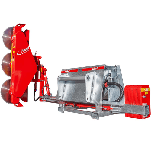 Tête de scie 700 mm. Hauteur de coupe 2,10 m. Ø de coupe jusqu’à 280 mm. Bras de déport 1,20 m. Contrepoids 210 kg, attelage EURO. Autres attelages en option.