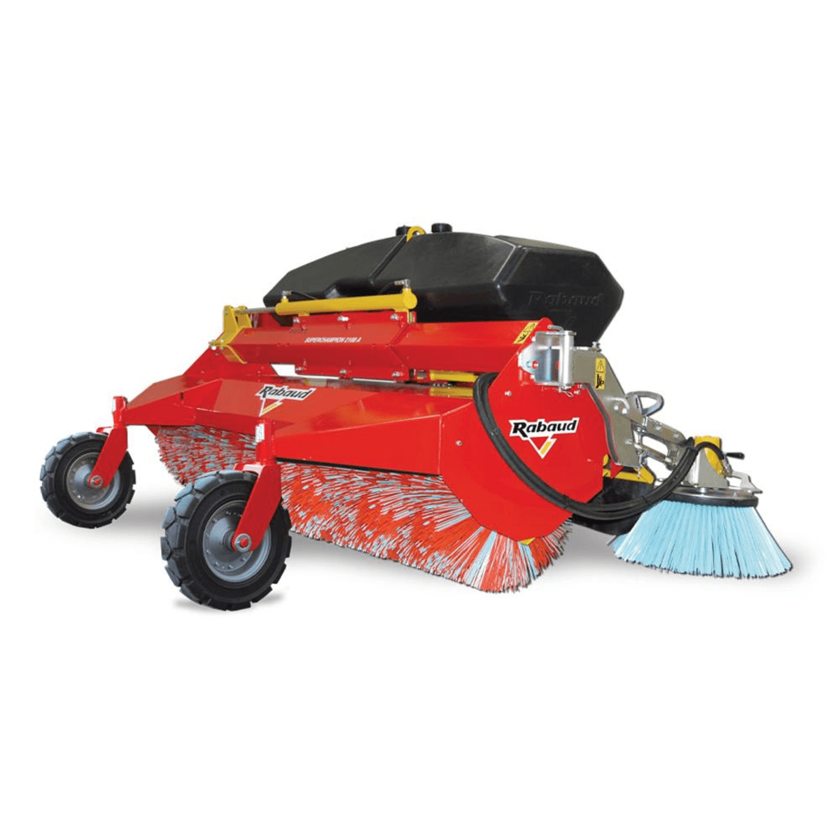 Balai largeur 2,10 m, Ø 0,60 m. Déport droite/gauche 450 mm. Orientation +/- 30°. 2 roues pleines et increvables 400 mm, pivotantes 360°, avec graisseur. Entraînement pompe tracteur. Options disponibles : déport et orientation hydraulique, balai latéral, arrosage...