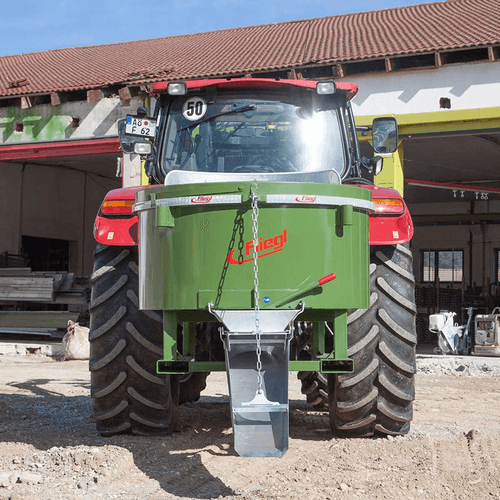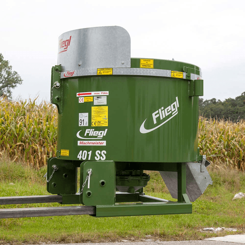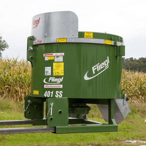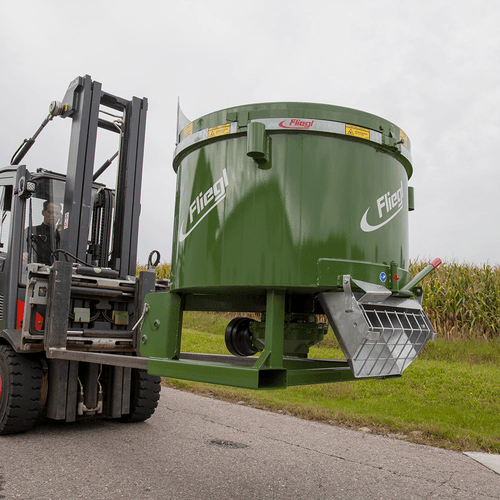 Attelage sur chariot élévateur. En fonction du modèle, la puissance requise de 40 cv à 120 cv et le diamètre de remplissage de 1 200 mm à 1 880 mm et avec un débit en une heure allant de : 7 m³ à 15 m³