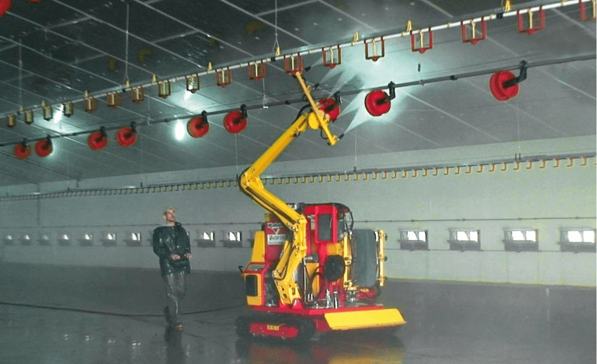 La laveuse de bâtiments avicoles LAVICOLE est montée sur un chenillard totalement radiocommandé qui permet le travail sur béton comme sur fumier. Quatre dispositifs de lavage permettent un lavage de qualité et complet du bâtiment :