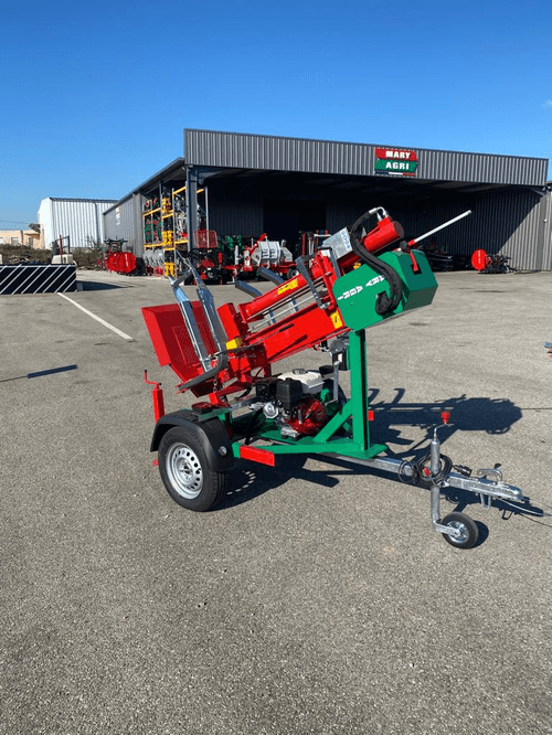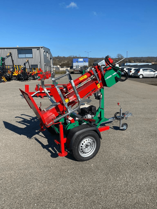 En version verticale, nous proposons une fendeuse de 14 tonnes de puissance de fendage, avec une course de vérin de 1100 mm et un passage de bûches de 1150 mm, Monté sur un châssis routier de qualité avec essieu Alko et roues 13.