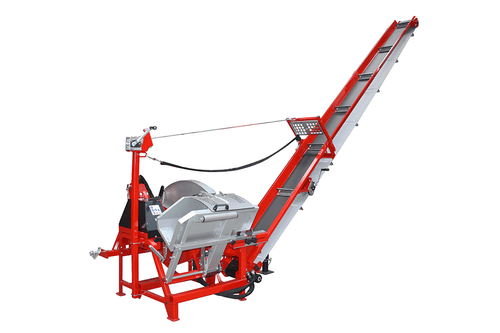 Scie circulaire à chevalet avec tapis monte bois. PDF tracteur 380 tr/min, tapis longueur 5 m, hauteur de déchargement 3 m. Equipé d’un bras de maintien automatique, d’un système de réglage de la vitesse du convoyeur et d’une lame carbure.