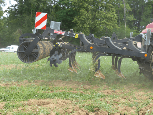 Petit déchaumeur à dents porté BEARCUB châssis tripoutre 100 x 100 mm et 3 rangées de dents type Blackbear avec socs, à sécurité non-stop ressort, hauteur 720 mm et dégagement sous châssis 850 mm. Ecartement entre dents 300 mm et entre barres 700 mm. Rangée de disques niveleurs type FLEAU 450mm montés sur sécurités élastomères 40 mm, réglage mécanique des disques de nivellement et de la profondeur de travail. Rouleau Z de 500 mm de diamètre.