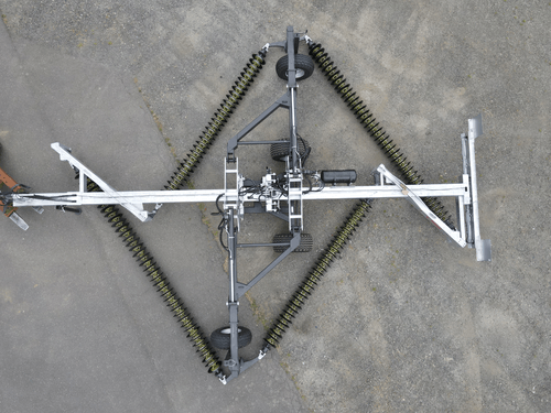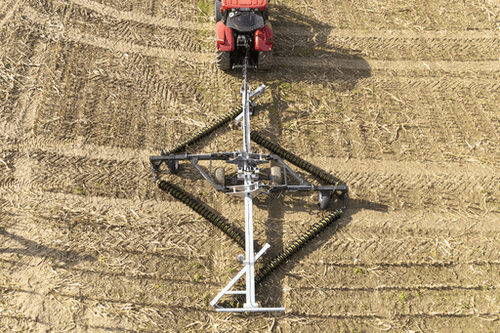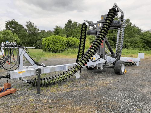 Basculement hydraulique, attelage par barre inférieure CAT II/III, largeur de travail : env. 7 m. Poids env. 5 700 kg. Longueur totale : 10.8 m env. Poids d’un disque : 2.7 kg, Ø disque : 350 mm, écart entre les disques : 130 mm. Unité standard (poids par mètre) : 120 kg/m. Vitesse de travail requise : 10 - 18 km/h. Vitesse de transport max. 30 km/h. Rendement surfacique : env. 12 hectares/heure. Essieu de freinage et installation pneumatique, 3 connexions double effet requises (5 connexions double effet requises pour le modèle à déplacement axial) ou 1 double effet avec option pupitre de commande.