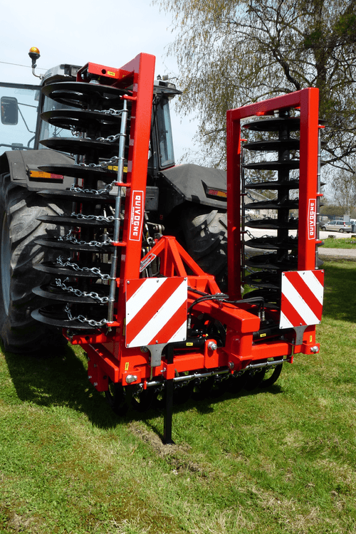 Equipé d’un attelage 3 points en chape poussé directionnel catégorie 2, anneaux fonte de 700 mm de diamètre à branches incurvées, angle 45°, décrottoirs à chaines.