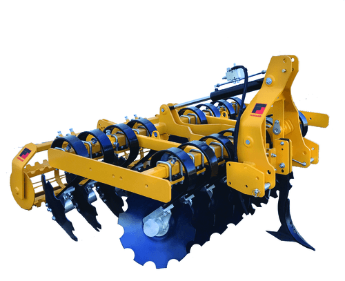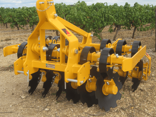 Ces déchaumeurs à disques Discosol ont une largeur de travail de 1,50 m à 3 m en fonction du modèle. Avec relevage fixe ou hydraulique, sécurité par ressort à lame, rouleau cranté Ø 360 mm, disques Ø 510 mm, attelage cat. 2, châssis 80 x 80 x 8 mm. La configuration des disques en V ou en X en fonction du modèle Discosol V ou Discosol X. Dent centrale sur le modèle Discosol X. Le nombre de disque varie en fonction du modèle de 8 à 20 disques. Palier à rouleaux coniques sans entretien.