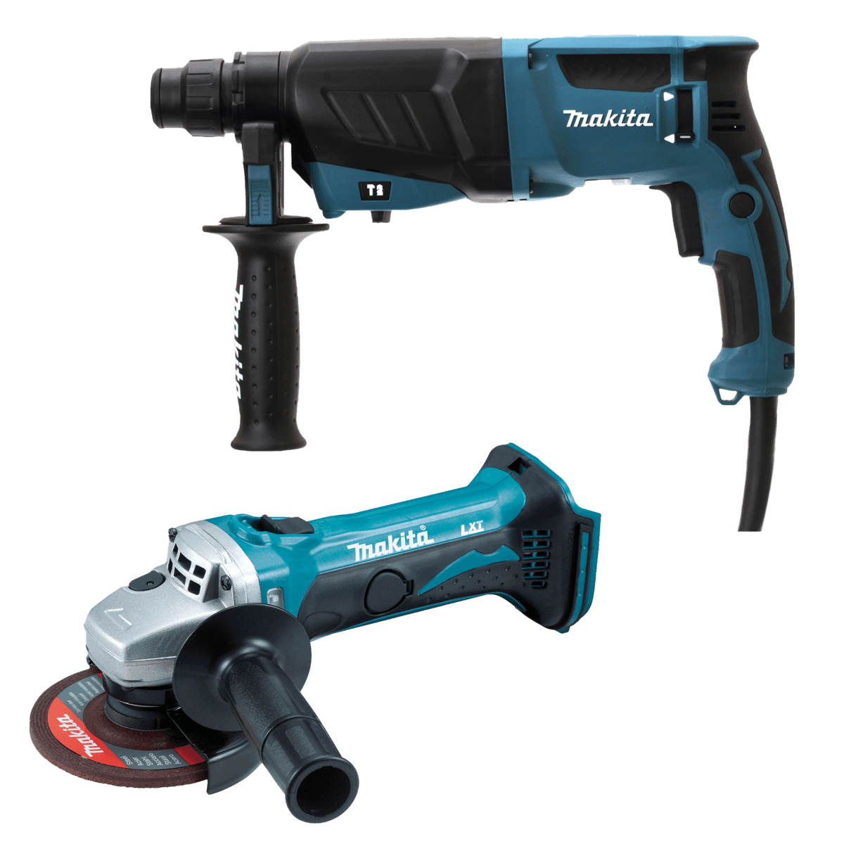 Perforateur-burineur SDS-Plus HR2630 filaire 3 fonctions : perçage, perforation et burinage. Puissance : 800 W. Force de frappe max : 2,4 J. Fréquence de frappe à vitesse de rotation nominale : 4600 coups/min. Vitesse de rotation nominale : 1200 tr/min. Diamètres de perçage dans le béton : 26 mm, 80 mm avec trépans. Diamètres maxi acier : 13 mm, bois : 32 mm. Réversibilité droite/gauche. Meuleuse DGA452Z. Diamètre disque : 115 mm. Diamètre alésage : 22,23 mm. Régime à vide : 11000 tr/min. Poignée à revêtement Soft Grip pour plus de confort. Livrée avec : carter à ébarber 115 mm. Clé à ergots. Meule à ébarder à moyeu déporté 115mm. Poignée latérale pour meuleuse. Livrée sans batterie.