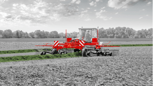 Andaineur 2 rotors avec largeur de travail de 7,20 à 8,50 m réglable hydrauliquement. Triples tandems brevetés SIP (6 roues/rotor), suivi de sol 3D et levage séparé des rotors.