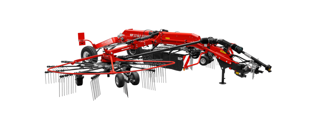 Andaineur central 2 rotors avec largeur de travail de 7,60 à 8,60m réglable hydrauliquement. Triple tandems brevetés SIP (6 roues/rotor), suivi de sol 3D et relevage séparé des rotors.