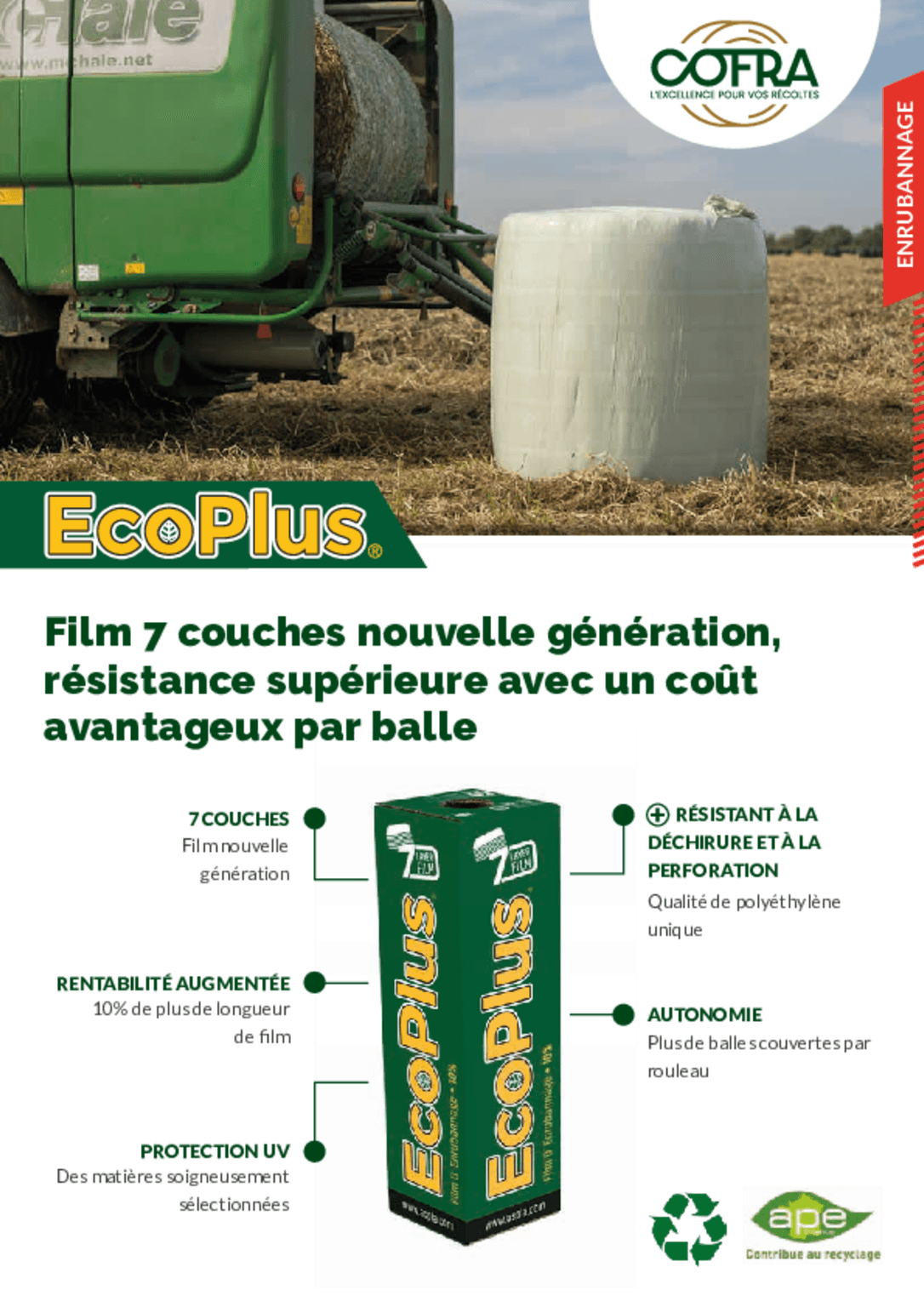 Film d'enrubannage Eco Plus. Couleur : vert. Largeur : 750 mm. Longueur : 1650 m. Épaisseur : 22 µm. Nombre de couche : 7.
