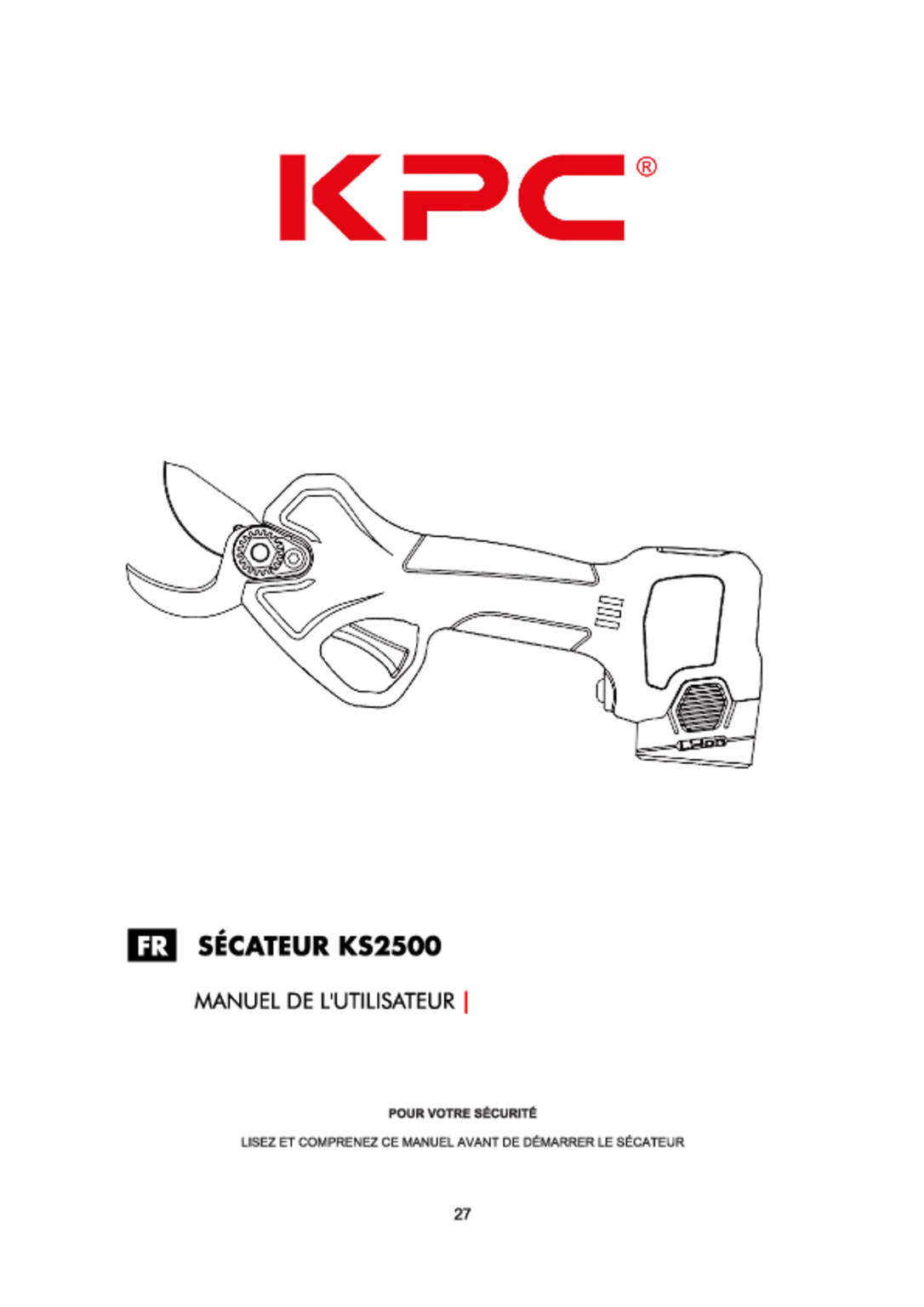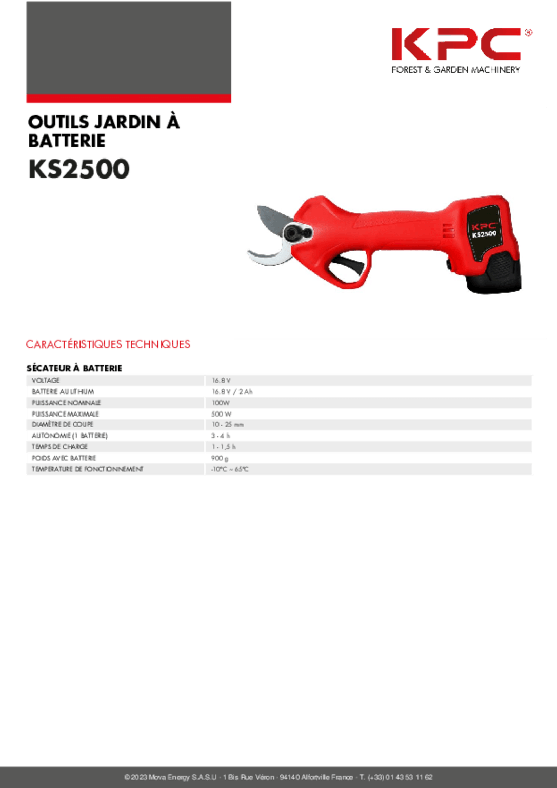 Sécateur à batterie avec étui. Moteur brushless. Puissance : 400 W. 2 batteries lithium 10,8 V- 2,5 Ah....