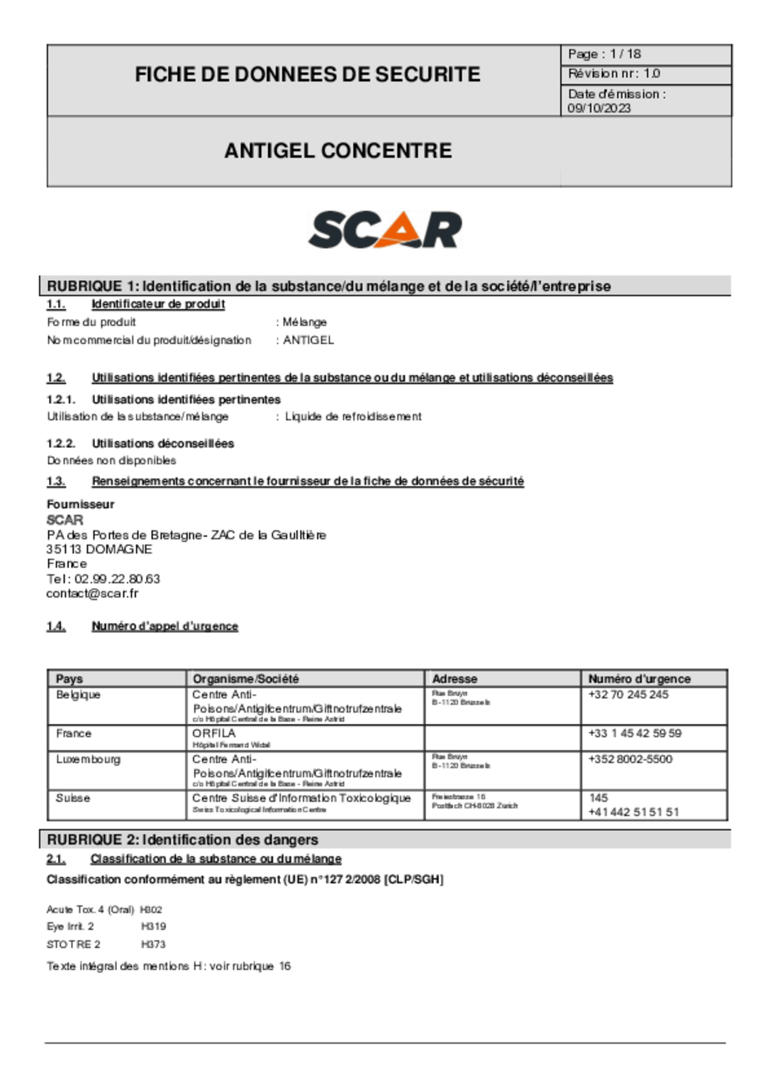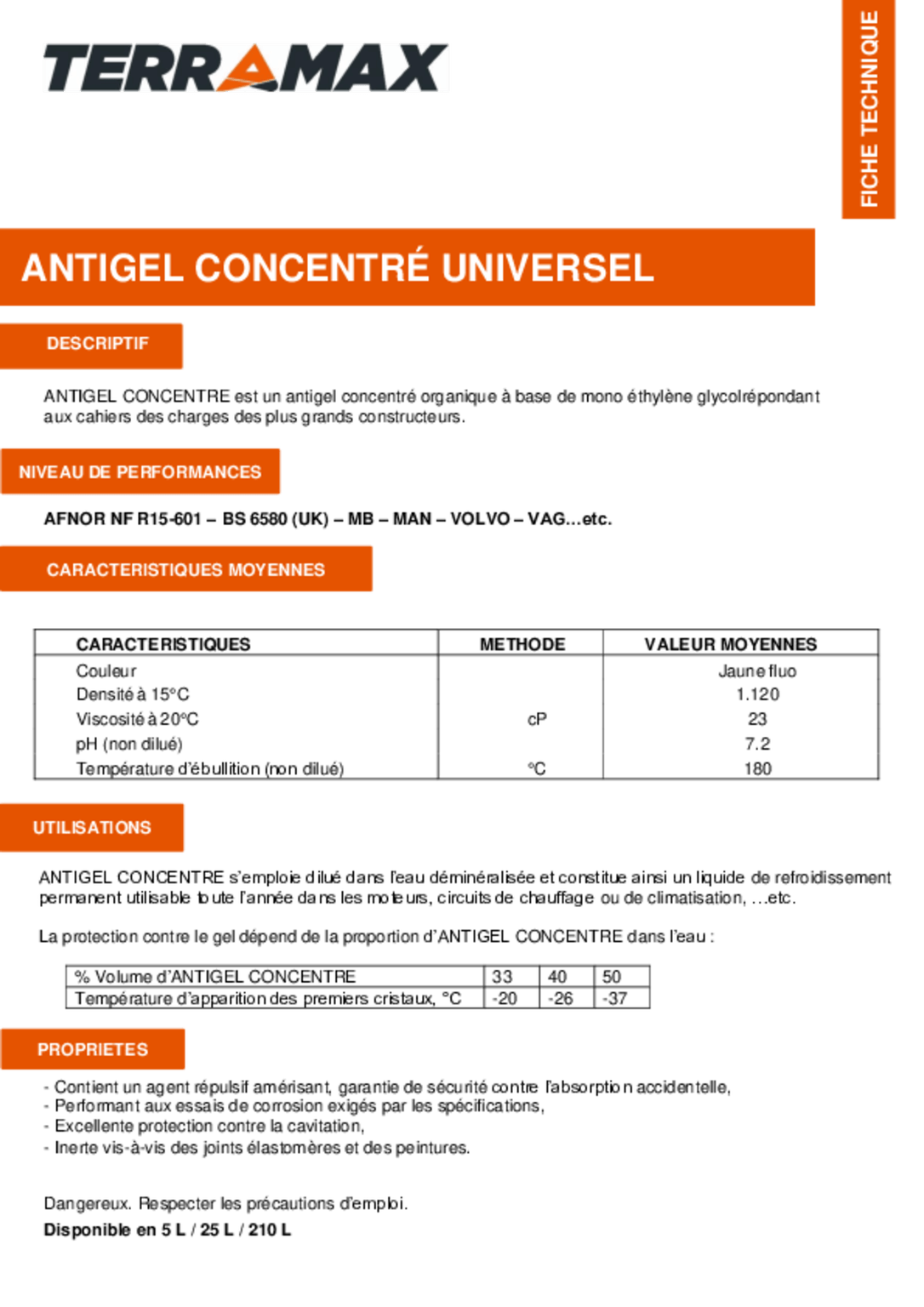 Prêt à l'emploi. Antigel organique inhibé à base de mono-éthylène glycol. Existe en 5 L (réf.70178).