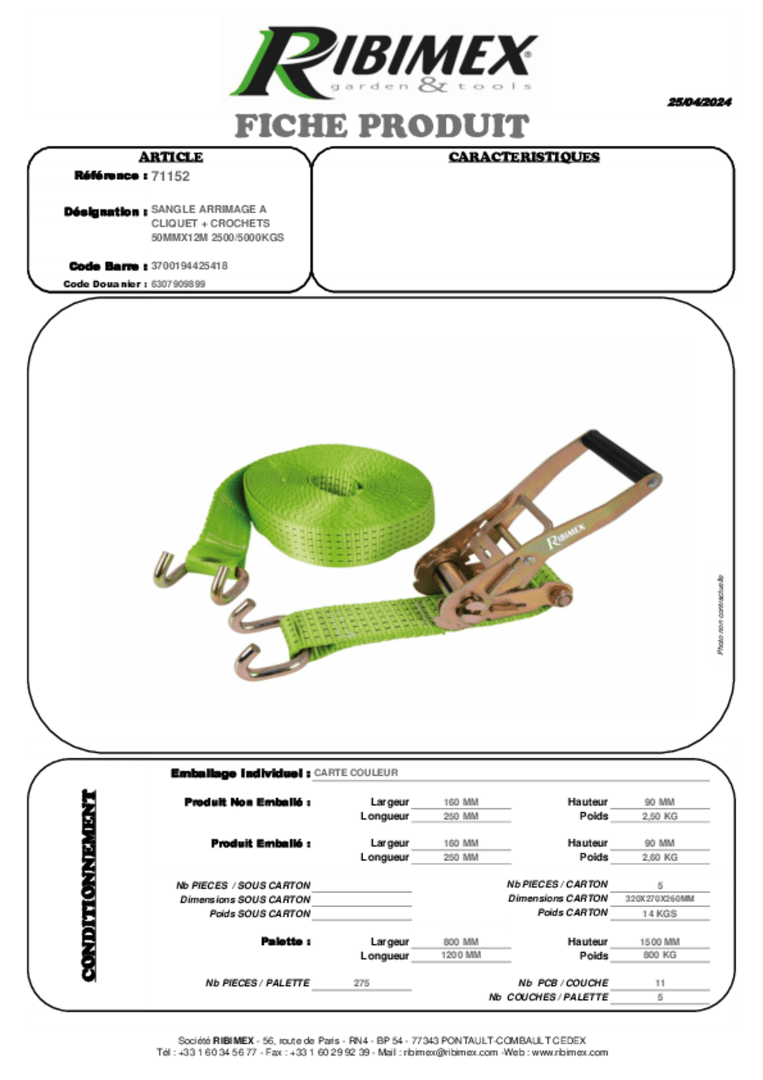 Capacité d'arrimage (LC) : 2500 daN/Kg.