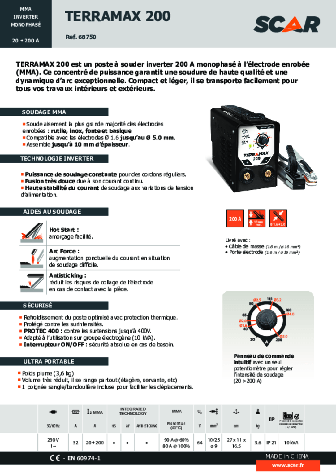 230 V - 16 A. Soudures sur acier, fonte et inox. Soudures TIG lift (DC). Pour électrodes de diamètre...
